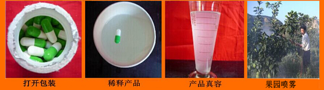 瓜果壯蒂靈:適用于蘋果、柑橘、龍眼、芒果、李子等各種水果,西瓜、冬瓜、南瓜、香瓜等瓜類。 每15公斤液體中加入本膠囊1粒,也可以加多粒,攪拌溶解后噴霧于植物表面。本品PH值中性,遵照使用要求稀釋后噴霧,亦可以和各種農(nóng)藥及葉肥混合使用。稀釋液存放保質(zhì)期30天。果樹一般在開花前、幼果期、果實(shí)膨大期各噴一次。共3次,每10顆膠囊可兌水150公斤,噴1畝成齡果園為宜。